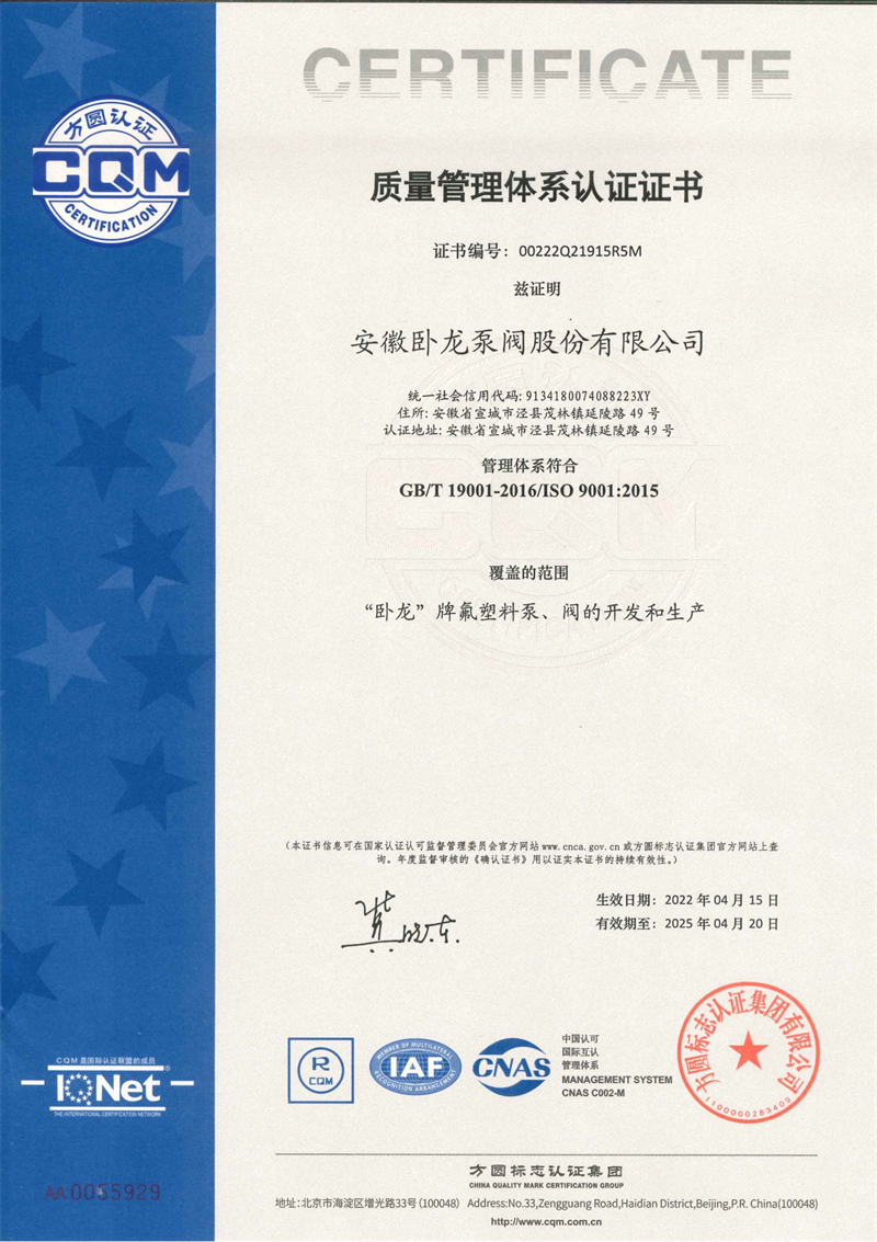 安徽臥龍泵閥股份有限公司:氟塑料泵閥產品生產和研發專家